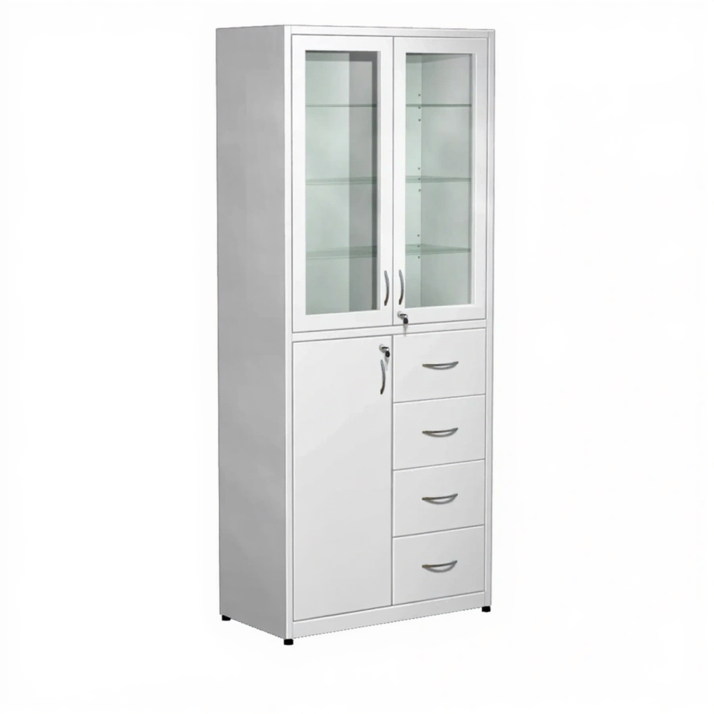 Шкаф для медикаментов стекло в металлической рамке, с ящиками ШМ-4 (белый) активно используются в больницах, лабораториях, аптеках, где необходимо хранение медикаментов, медицинского инвентаря, одежды работников, приборов, больничной документации.