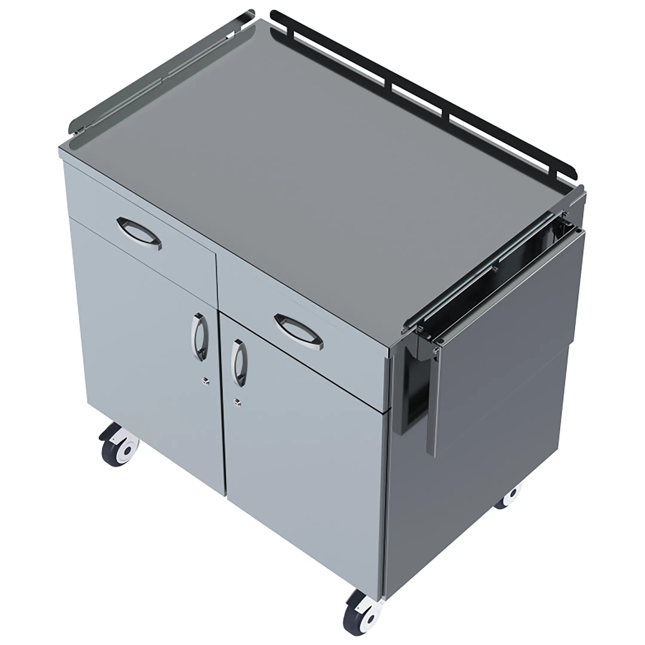 • колеса поворотные, самоориентирующиеся, диаметром 100 мм, комплектуются надёжной стальной вилкой с прецизионным радиально-упорным подшипником, ободом из полипропилена и шинкой из серого полиуретана, не оставляющего следов на полу, два колеса – с индивидуальным тормозным устройством;