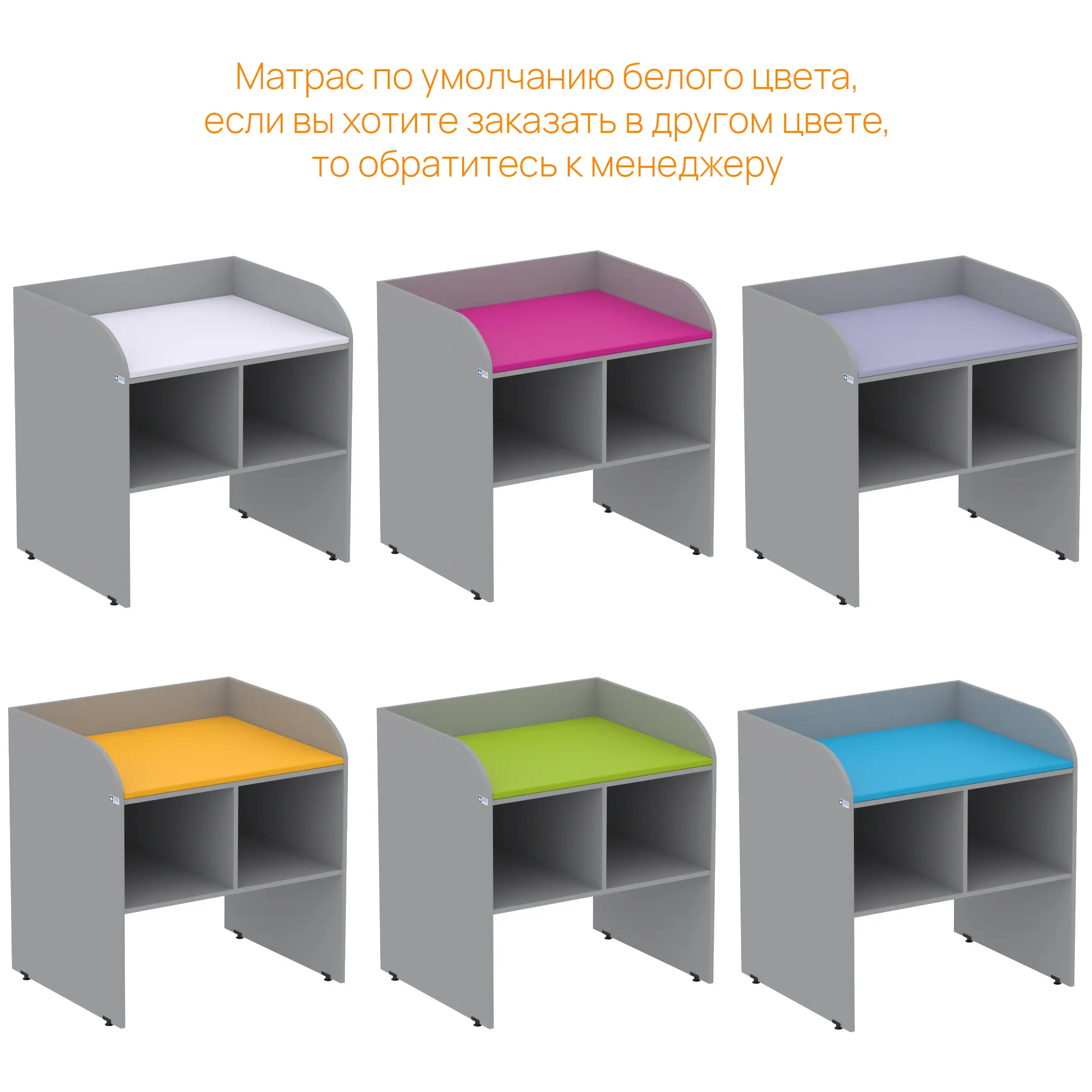 - Комплектация мягким матрасом — матрас белого цвета входит в стандартную комплектацию (по запросу доступны другие цвета: синий, сиреневый, лайм, оранжевый, розовый).