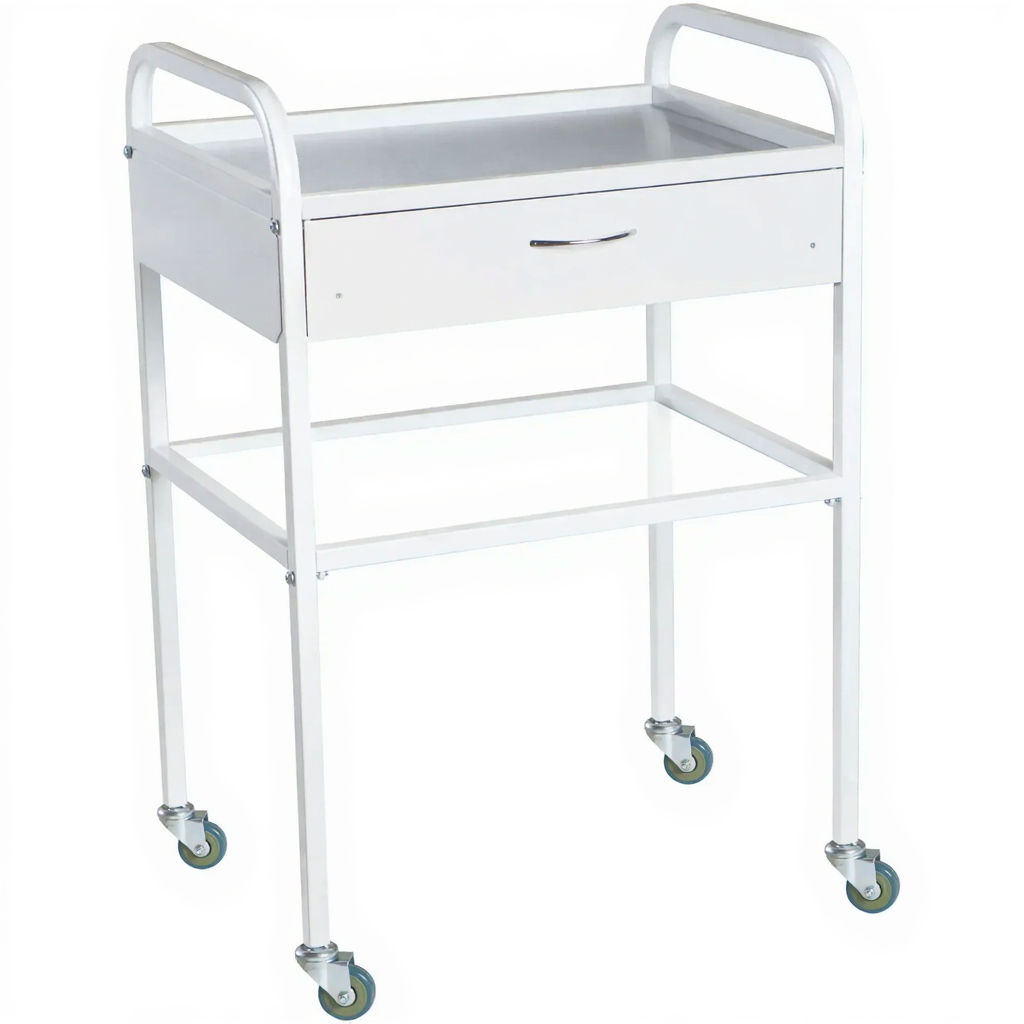 Столик медицинский инструментальный СМИ-02-01 (полки металл + нерж. сталь, колёса серая резина) — это компактный мобильный столик, предназначенный для размещения инструмента, лекарственных препаратов и приборов в медицинских учреждениях и лабораториях. Модель имеет каркас из профильной стальной трубы, комбинированные полки (металл и нержавеющая сталь) и один выдвижной ящик.