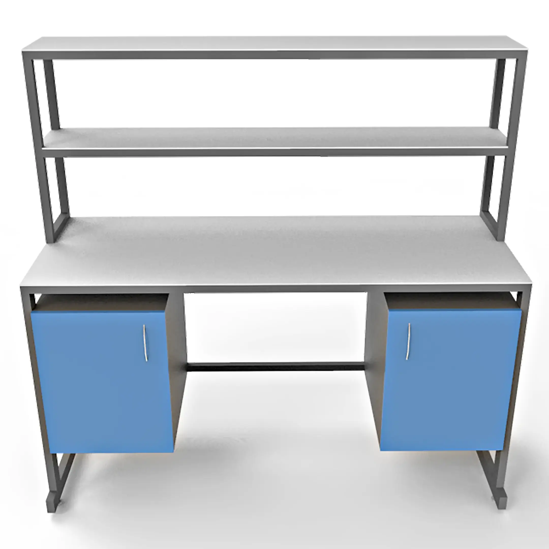 - Удобная система хранения — две тумбы под столешницей с распашными дверцами и надстройка с двумя полками для хранения материалов и оборудования.