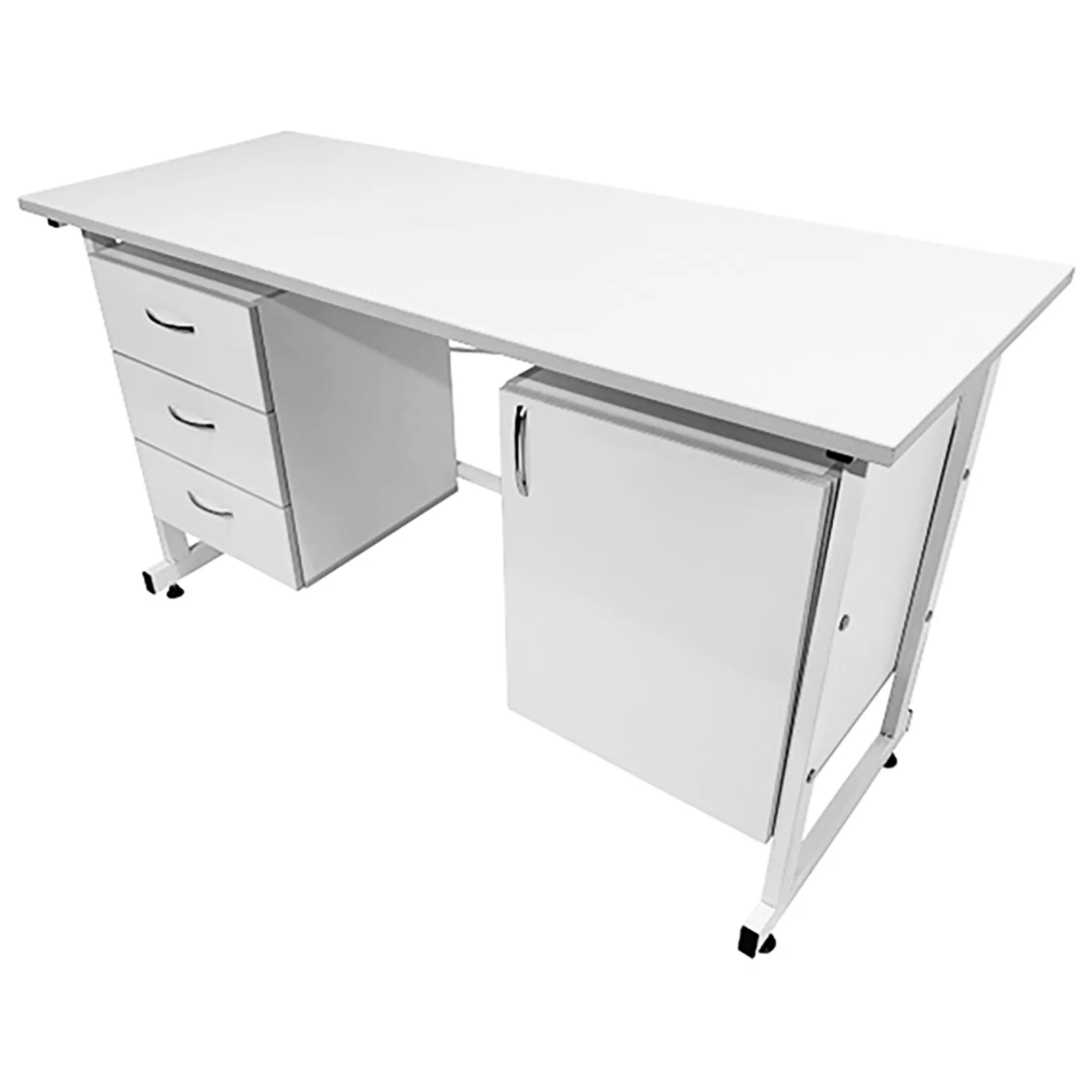 - Комбинированная система хранения — левая тумба с тремя выдвижными ящиками, правая тумба с распашной дверкой и полкой для удобного хранения материалов.