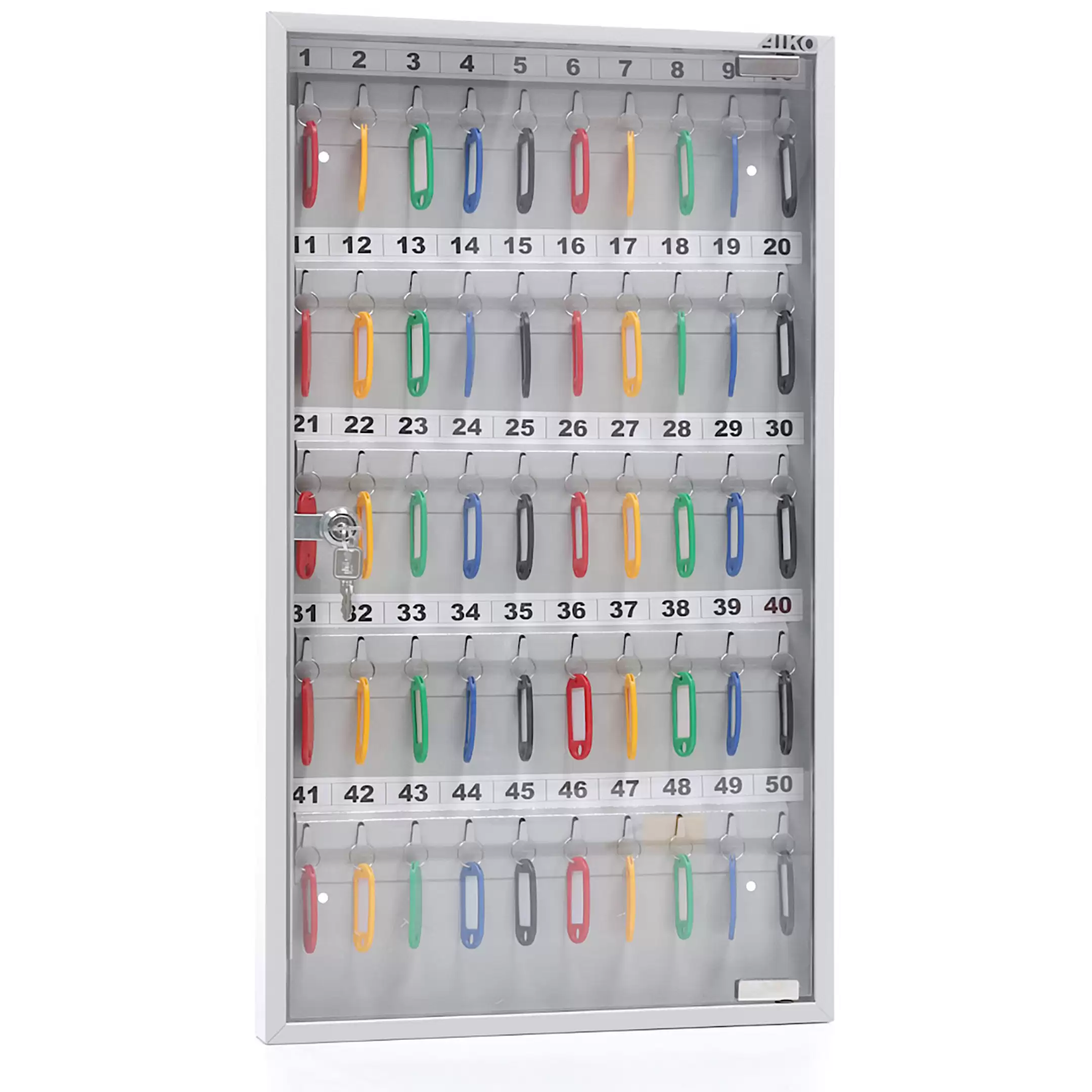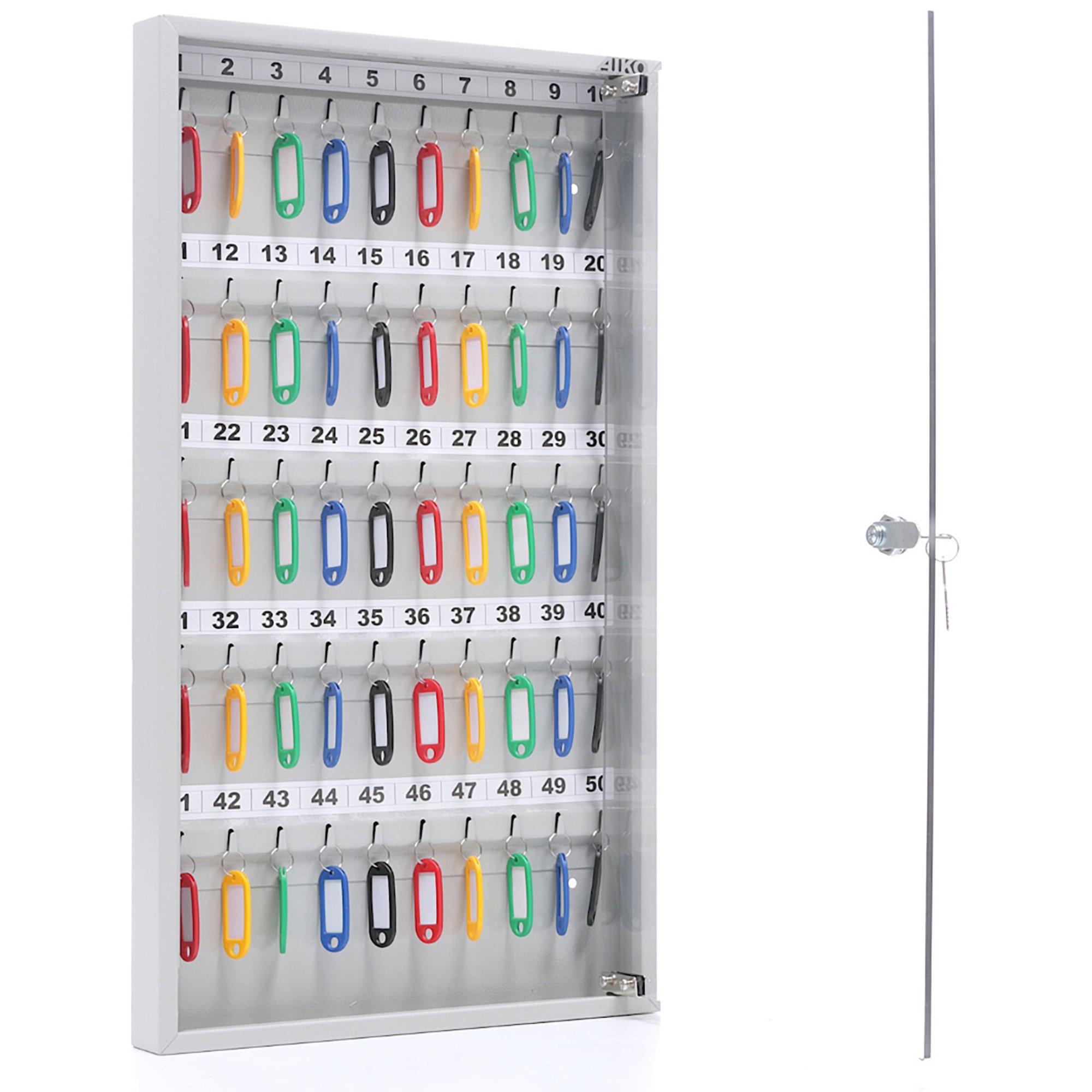 - Оптимальная вместимость для рабочих мест и точек доступа — система рассчитана на 50 ключей, что идеально подходит для организации хранения на стойке администратора, в диспетчерской, на посту охраны или в отделе, где требуется систематизировать и контролировать значительный набор ключей.