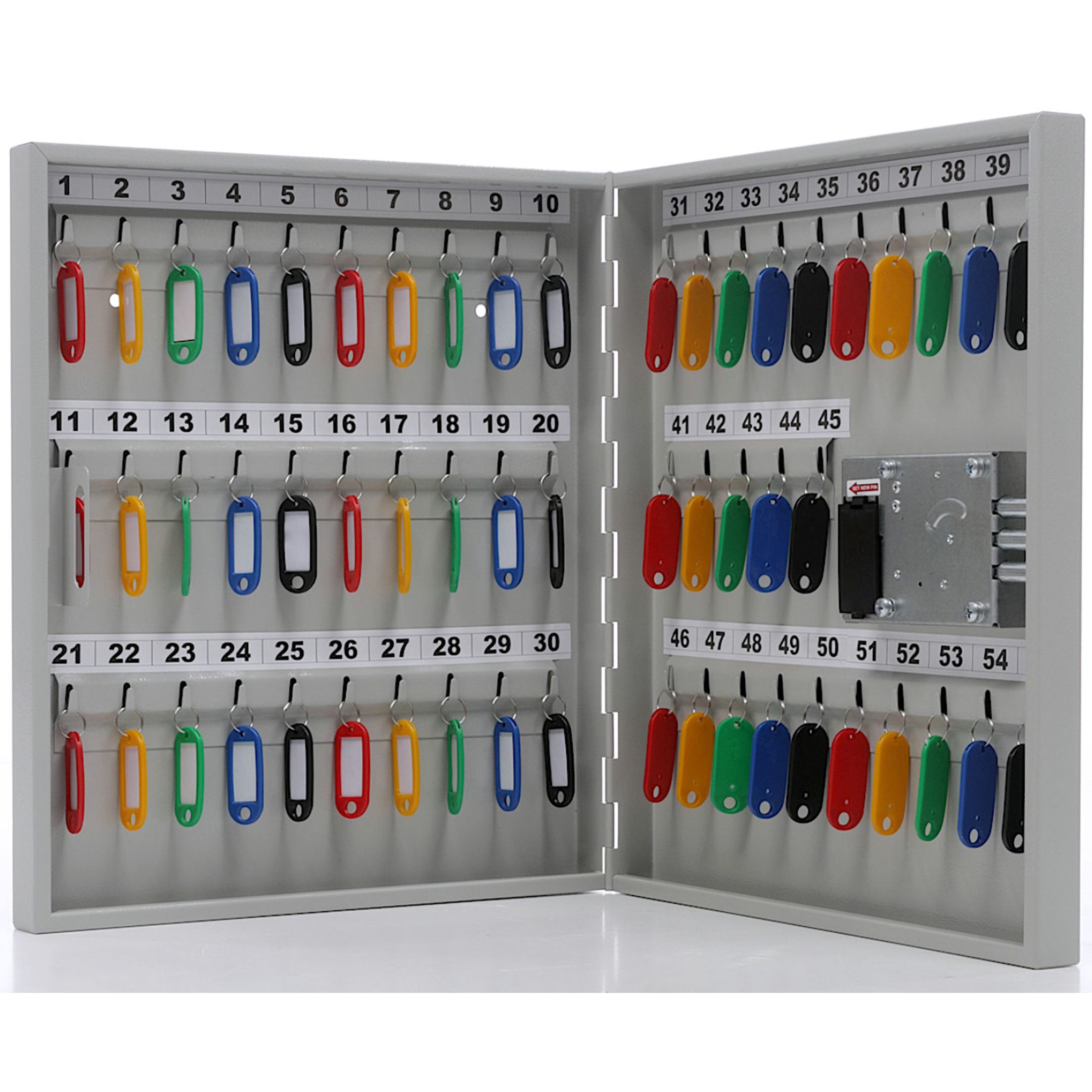 - Четкая систематизация и быстрый поиск — 55 металлических крючков и комплект цветных брелков с самоклеящимися номерками позволяют логично распределить ключи по назначению, категориям или ответственным лицам, что значительно экономит время на их поиск и выдачу.