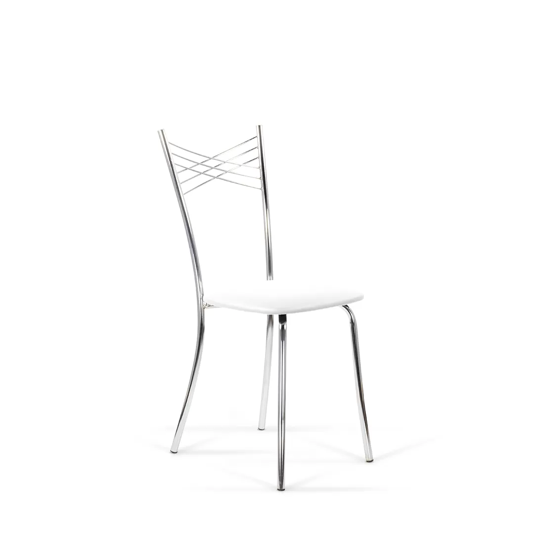 Воздушная модель стула имеет интересный дизайн спинки, представляющую собой крестообразное пресечение нескольких металлических нитей, образующих в центре маленькие ромбики. Каркас стула выполнен из хромированного металла