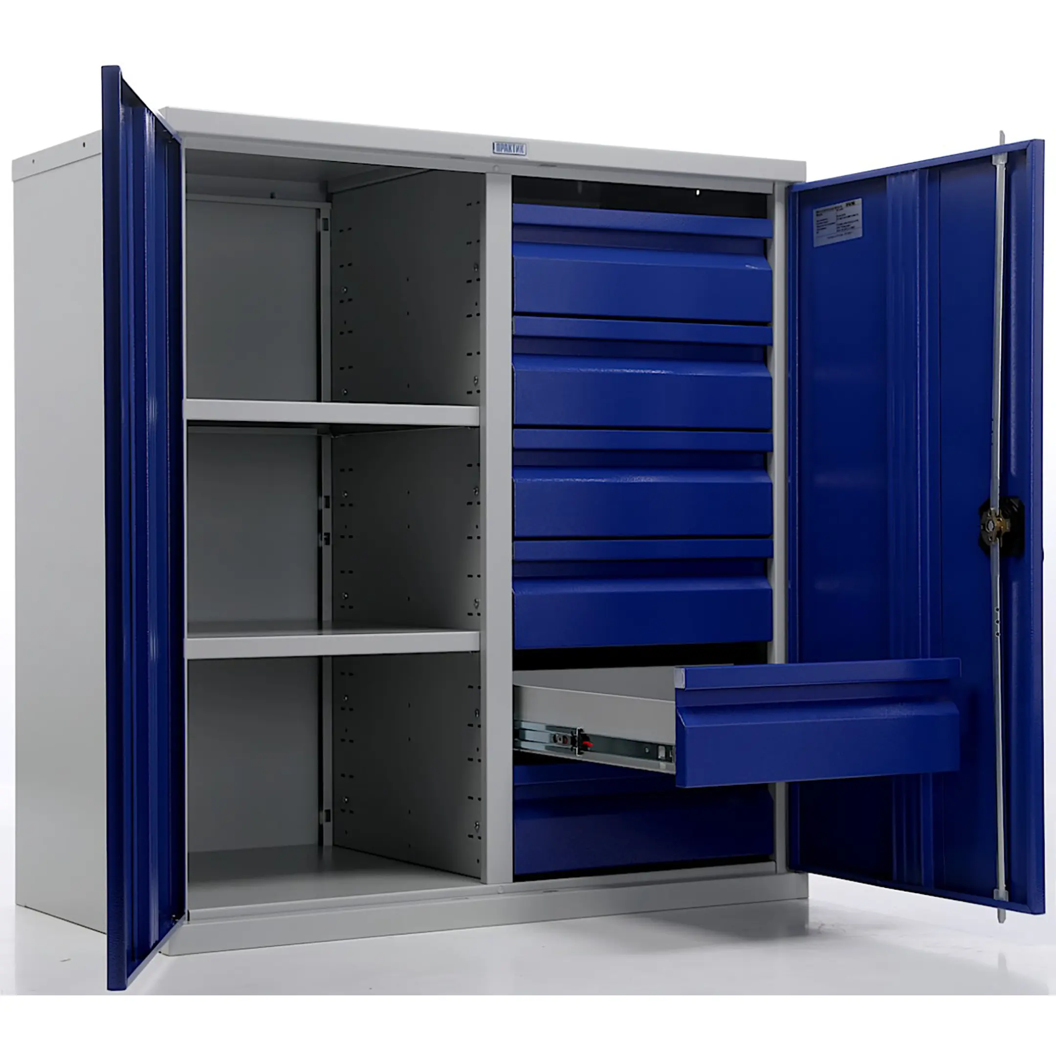 - Надежная защита содержимого — прочный стальной корпус и запирающиеся на замок двери обеспечивают защиту ценного инструмента от кражи, несанкционированного использования, а также от пыли и влаги в нерабочее время. Замок гарантирует базовый уровень безопасности.