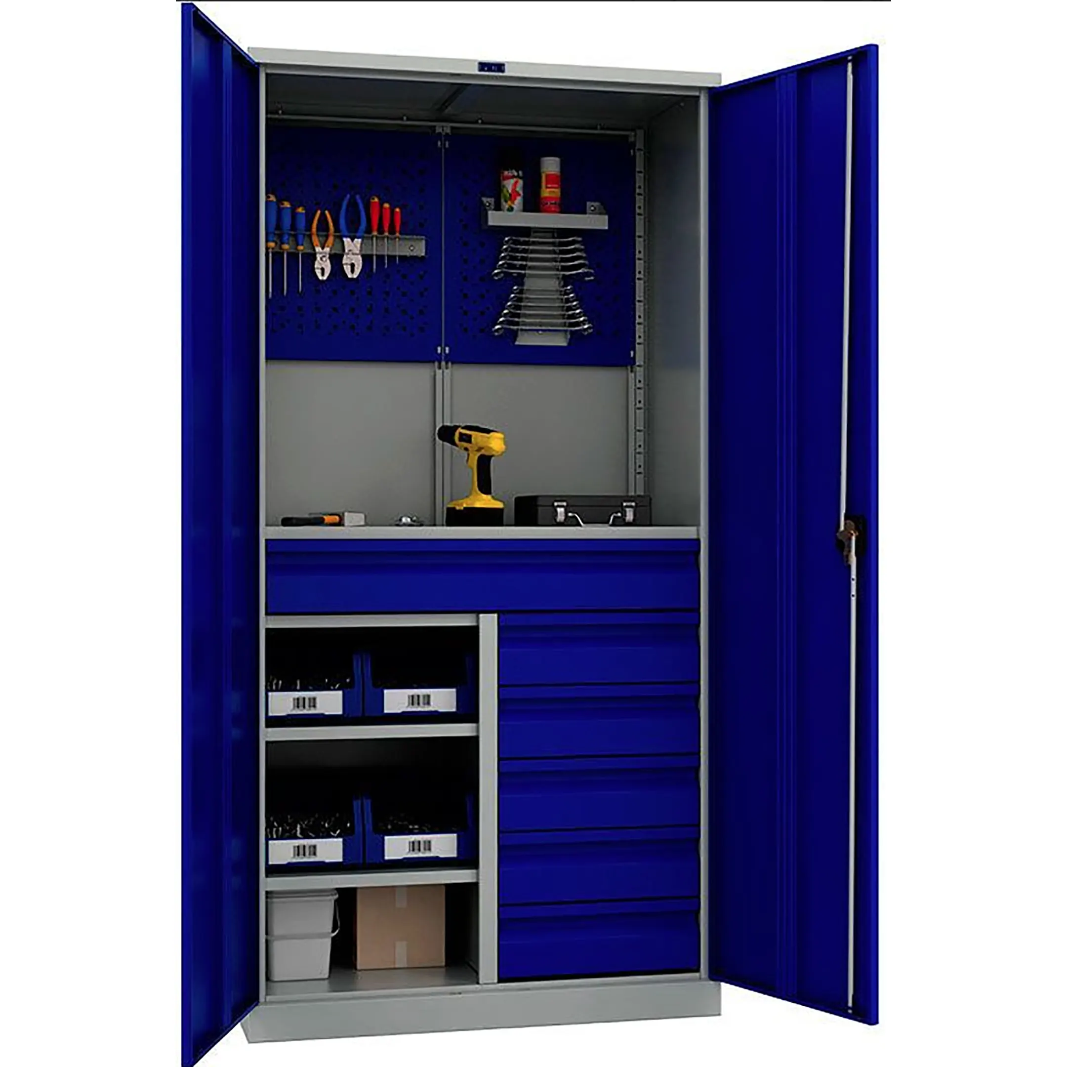 - Максимальная безопасность и защита от доступа — все ящики и верхняя распашная дверца объединены в единую систему и запираются на высоконадежный врезной замок с несколькими точками запирания. Это гарантирует полную сохранность дорогостоящего инструмента и предотвращает его несанкционированное изъятие.