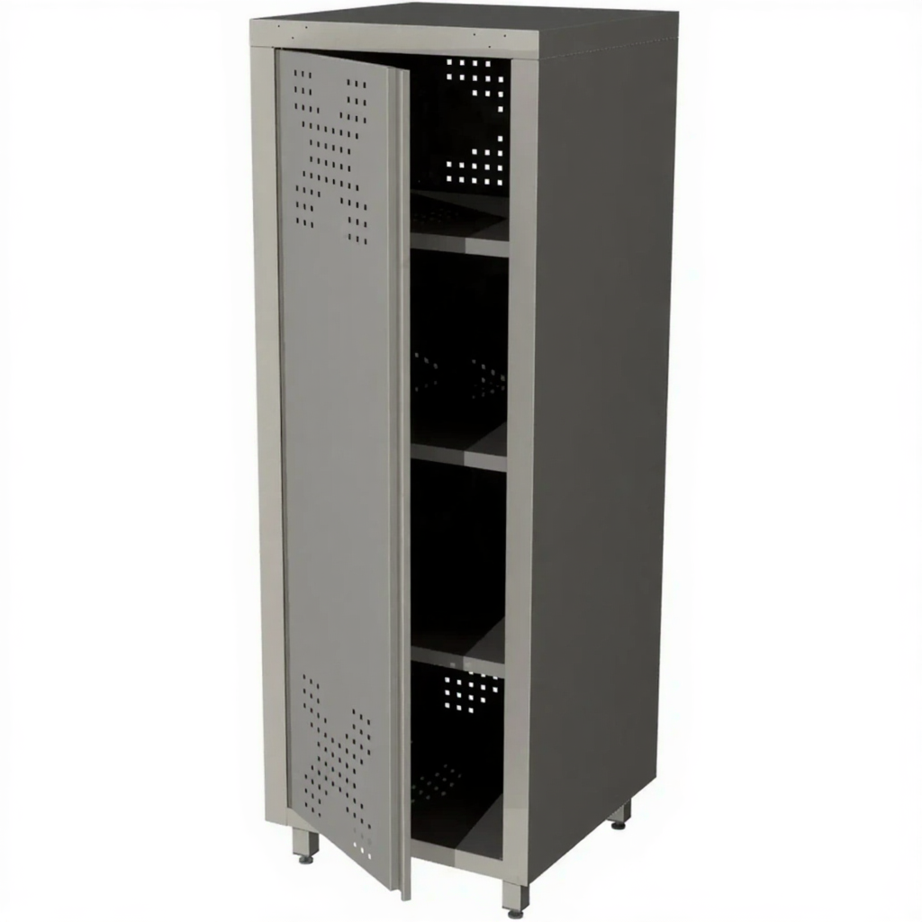 - Прочность и долговечность — шкаф изготовлен из прочного металла с защитным покрытием, устойчивого к влажности, механическим воздействиям и частой санитарной обработке. Конструкция рассчитана на длительный срок службы в условиях интенсивного использования.