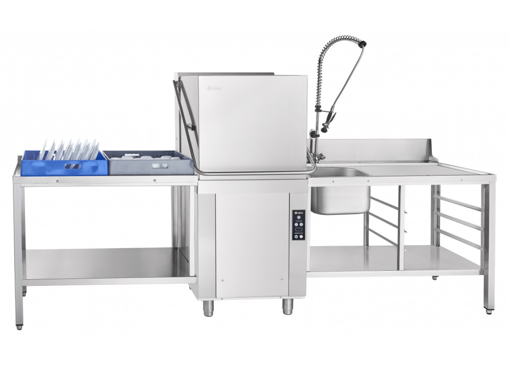 Стол модели СПМП-6-3 условно разделен на две зоны. Первая — это рабочая поверхность для складирования посуды. В ее нижней части предусмотрены направляющие для четырех кассет размером 500х500 мм. Вторая зона состоит из цельнотянутой мойки с душирующим устройством, где посуду предварительно обрабатывают. Объединяет обе зоны функциональная нижняя полка. Используют ее для выкладки посуды и инвентаря, а также хранения моющих средств и текстиля.