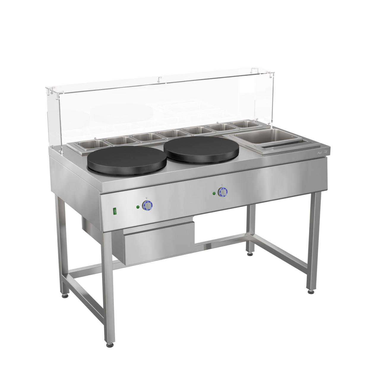 Блинная станция БС-2.400-1350.750-02 ЛАКОМКА — это профессиональное оборудование для предприятий общественного питания, предназначенное для выпечки порционных блинов, блинчиков, оладий и крепов. Модель оснащена чугунными жарочными поверхностями, обеспечивающими равномерный прогрев и стабильный результат.